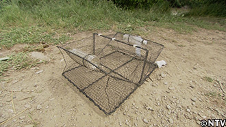 穴の近くに設置するのは、カニ獲り用のカゴ。 |