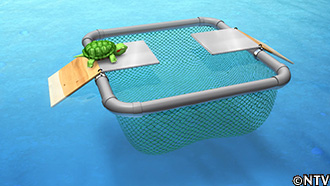 水に浮かべる浮島型で、亀が日光浴のため板を登ると、重みでシーソーの様に傾き内側に落ちる仕組み。 |