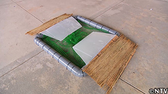 環境省が紹介する作り方を参考に、塩ビパイプやわらこもなど2万円以内で材料を買い揃え、組み立てる。 |