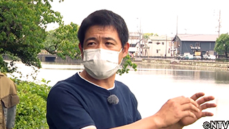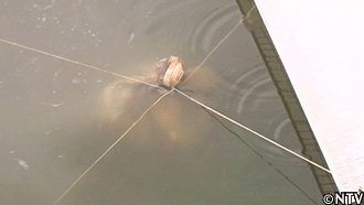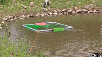 城島とシンタロー、スタッフがそれぞれ作成した日光浴ワナを、お濠と池に流されないよう固定する。 |