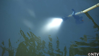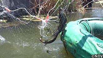 光が苦手なライギョを、水中ライトなどを付けた棒を使って追い込む。 |