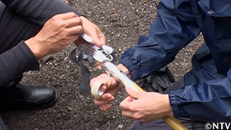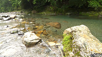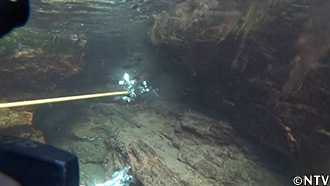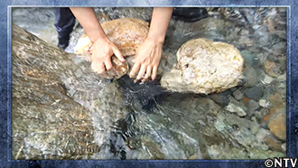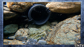 (4)ブラウントラウトが潜んでいそうな岩場の隙間などで(1)の棒を使って、ブラウントラウトを刺激する。 |