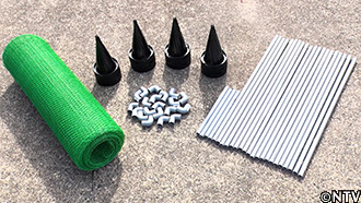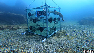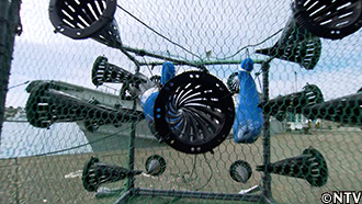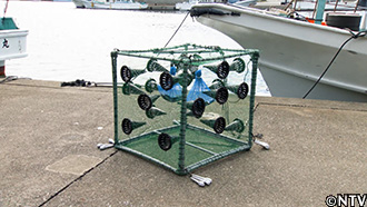 枠組みは海水でも錆びない塩ビパイプ。周りはウツボに食いちぎられないよう金網で。 |