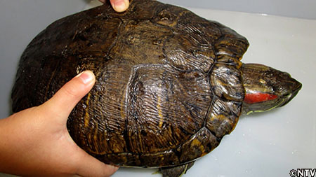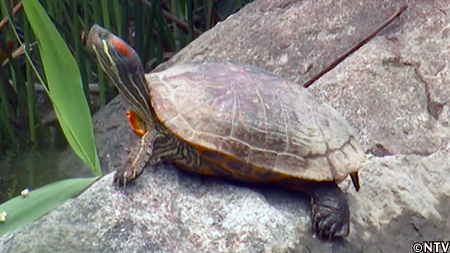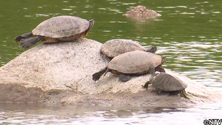 生物『ミシシッピアカミミガメ』 原産地アメリカ原産。 問題1950年代にアメリカから持ち込まれ、かつて祭りの縁日で売られていた幼体(ミドリガメ)がペットとして人気となったが、大きくなって野外に放たれることなどで全国的に繁殖。 |