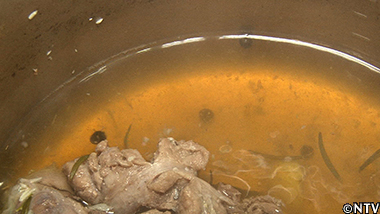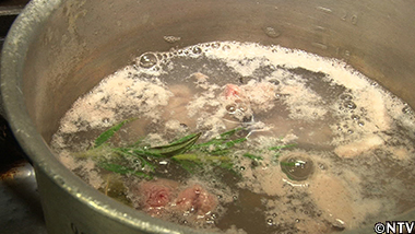 (1)ローズマリー・ローリエ・粒胡椒・白ワインとともに圧力鍋で20分ほど茹でる。 |