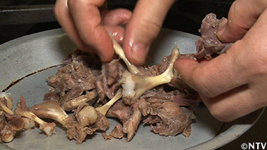 (2)柔らかくなった肉を取り出し、手でほぐす。 |