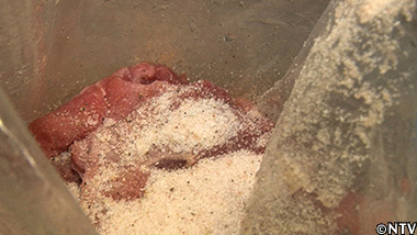 (1)カミツキガメの肉に岩塩・砂糖・胡椒を揉み込む。 |