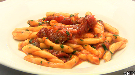 (6)茹で上がったパスタとソースを合わせ、塩で味を調える。 |