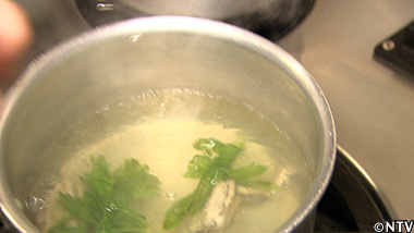(1)血抜きしたタウナギの身を、殺菌作用のあるセロリとともに下茹でする。 |