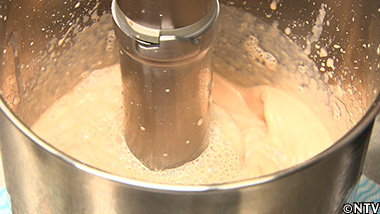 (2)冷まして水気を取り、卵、トマトソース、リーペリン(ソース)、塩、コショウを加えて、空気を含ませるようにミキサーで混ぜる。 |
