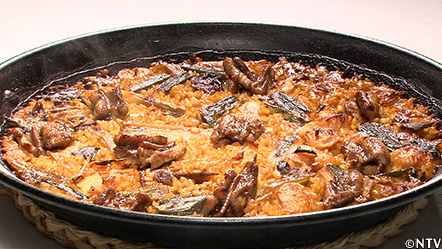 (2)タウナギの身を取り出し、パエリア鍋に、トマトソース、葉にんにく、ポルチーニ茸、白花豆、鶏のブイヨン、米を加えて火にかける。 |