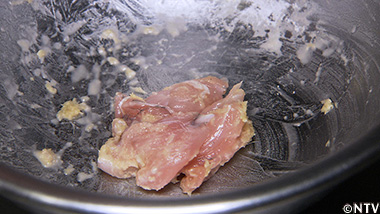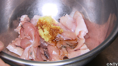 (1)もも肉を、ショウガで臭みを消しつつ、醤油で香り付け。 |