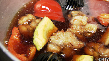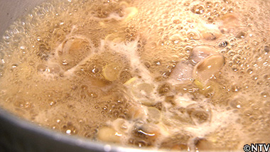 (3)臭みを抑えるネギとともに出汁で煮る。 |