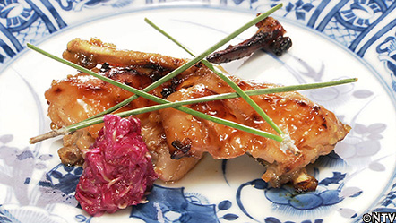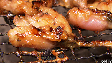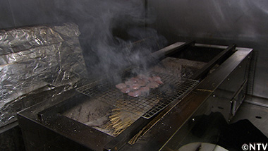 (2)炭火で焼くことで、表面は香ばしく、中は軟らかく焼き上がる。 |