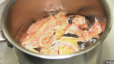 鍋にクララのアラと水を入れ、沸騰させて出汁をとる。 |