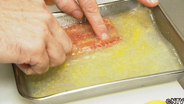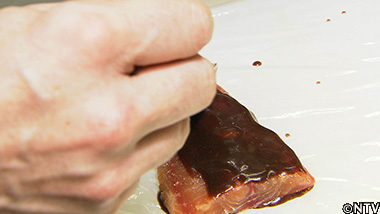 クララを25gのサイズに切り分けたものを2枚用意し、下味をつけ、両面にソースを塗る。 |