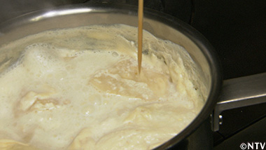 ムール貝を白ワインで火にかけ、煮汁を取っておく。 |