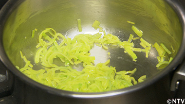 リーキ(西洋ねぎ)を薄く切って蒸し煮にし、シズレ(極細かいさいの目)に切ったスカンポを加え、鶏の出汁を加える。 |