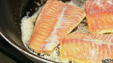 フライパンでバター焼き、アロゼ(バターを身にかけながら焼いていく調理方法)する。 |
