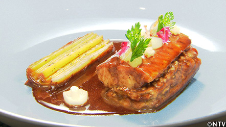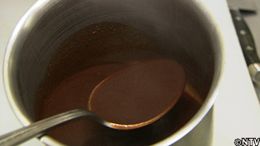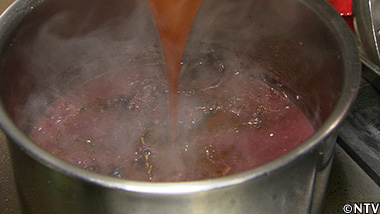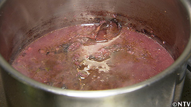 赤ワインをつぎ足し、しっかりと煮詰めたらフォンドヴォーを加え、さらに煮詰め、漉す。 |