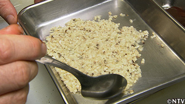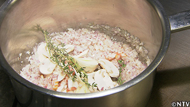 きのこを小さいサイの目にし、エシャロットをシズレ(極細かいさいの目)に切り、水分がなくなるまで炒め、デュクセルを作る。 |