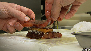 ラップの上にクララを一枚のせ、その上にデュクセル、フォアグラ、デュクセル、最後にクララの順に重ねる。 |