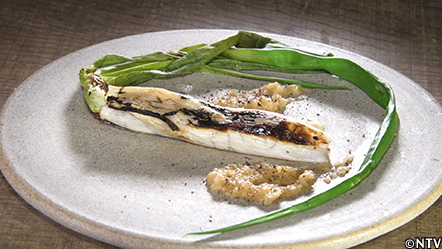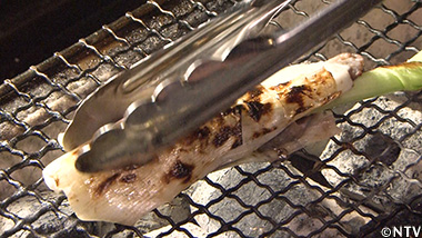 (4)ネギの上に巻いたタイワンハブの身の上に、さらに九条ネギを巻き、炭火で焼く。 |