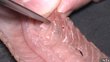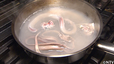 (1)タイワンハブの頭を切り、身の小骨を切る。 |