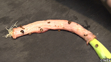 (3)消臭効果のあるネギの中でも、特に香りが強い京都九条ネギに巻きつける。 |