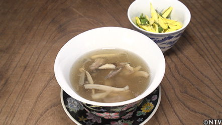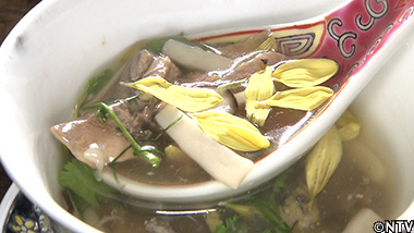 (4)さらに、解毒作用があるという言い伝えから、香港では、ヘビのスープに添える習慣がある菊の花と、味に変化をつけるためのパクチーやカフィアライム(コブミカン)をちらして頂く。 |