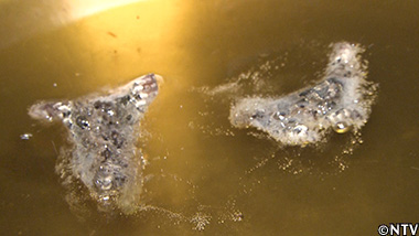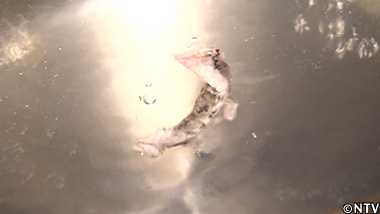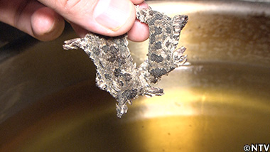 (2)臭みの原因となる鱗を一枚残らず丁寧に取り除き、ドライフルーツ作りで使う乾燥機へ入れて、水分を完全に抜く。 |