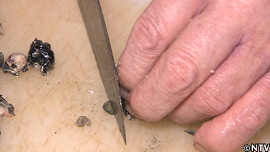 (2)ジャンボタニシの身は茹でると硬く締まるので、包丁で切れ目を入れて食べやすくする。 |
