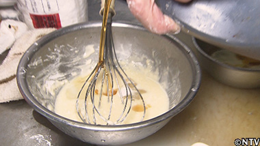 (3)卵、小麦粉、片栗粉で衣を作る。 香り付けにごま油を加える。 |
