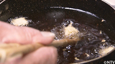 (4)衣をよくつけたら、190℃で2分間揚げる。 |