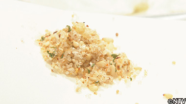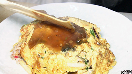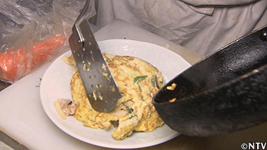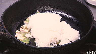 (5)焼いた卵を炒めたご飯の上に乗せる。 |