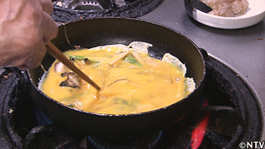 (4)タケノコ、シイタケ、長ネギを炒め、ジャンボタニシの出汁を加えた溶き卵に混ぜて焼く。 |