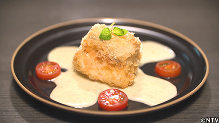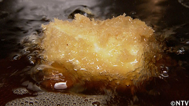 (2)重ねた身に衣をつけて、170℃の油でじっくりと揚げる。 |