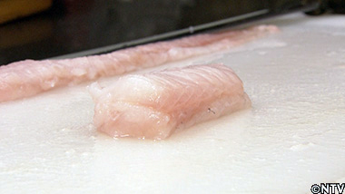 (1)クサウオの身は、水っぽくボリュームが無いので、三枚に重ねて食べ応えを出す。 |