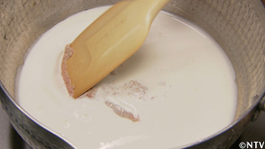 (4)裏ごしした肝に、生クリームを加えて肝ソースを作る。 |