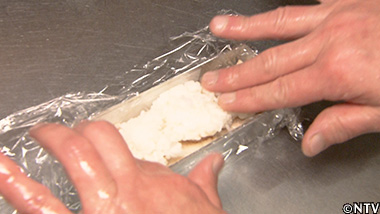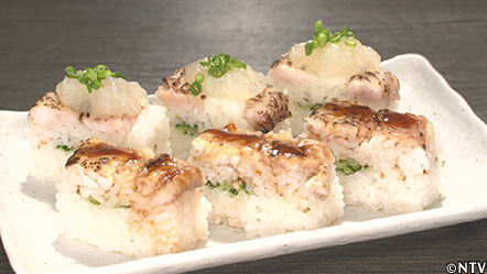 (4)押し寿司の型に、クサウオの身、シャリ(酢飯)、ごま、きゅうりを入れて、軽く押して押し寿司にする。 |