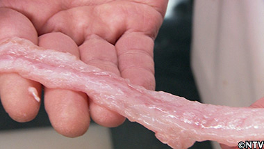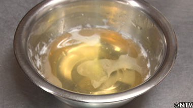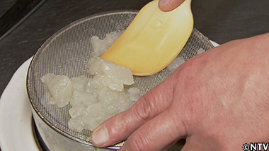 (7)冷えて固まったら、裏ごしして、出汁ジェルの完成。 |