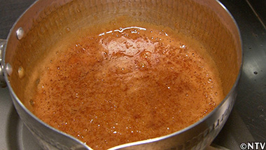 (8)カラメルソース、醤油、クサウオの出汁を3分煮込んで、クサウオの出汁入りツメダレの完成。 |