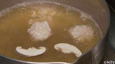 (1)余ったクサウオの身を包丁でたたき、丸めてつみれを作る。 |