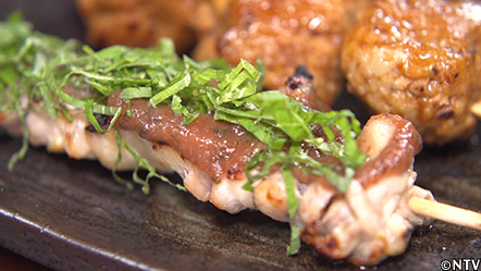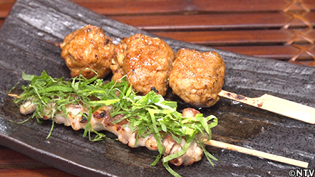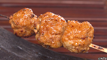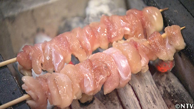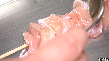 (4)串に刺し、酒、みりん、醤油、ザラメ、15年分の鶏エキスの入った秘伝のタレに漬けて焼く。 |