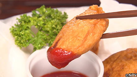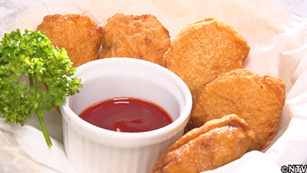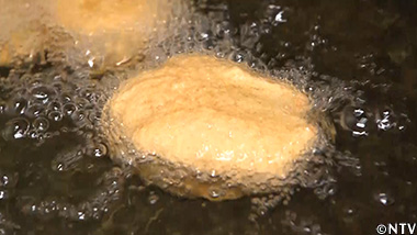 (4)形を整え、衣をつけて、油で揚げる。 |