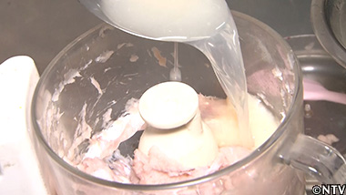 (3)ミンチにした肉に、出汁を加えて、ミキサーにかけよくなじませる。 |