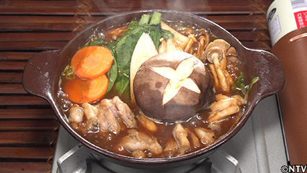 (2)ウシガエルの身、シイタケ、シメジ、長ネギなどを鍋に入れ、割り下を加える。 |