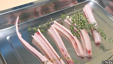 コンフィから身を取り出す際に余った骨を細かく砕き、メレンゲと混ぜて焼き上げる。 |
