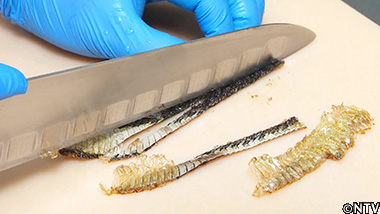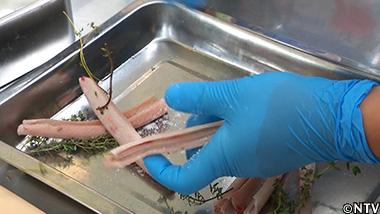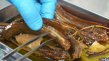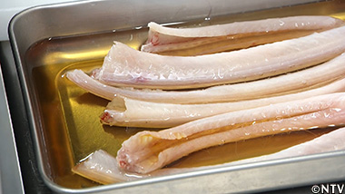 ワインでハブの身を漬ける。身を軟らかくすると共に、臭みを取る効果が。 |