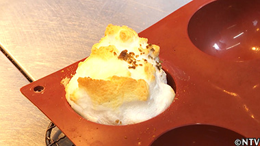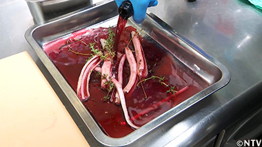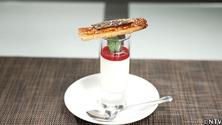 ハブエキスを加えたラズベリーソースのかかったパンナコッタを添え、完成。